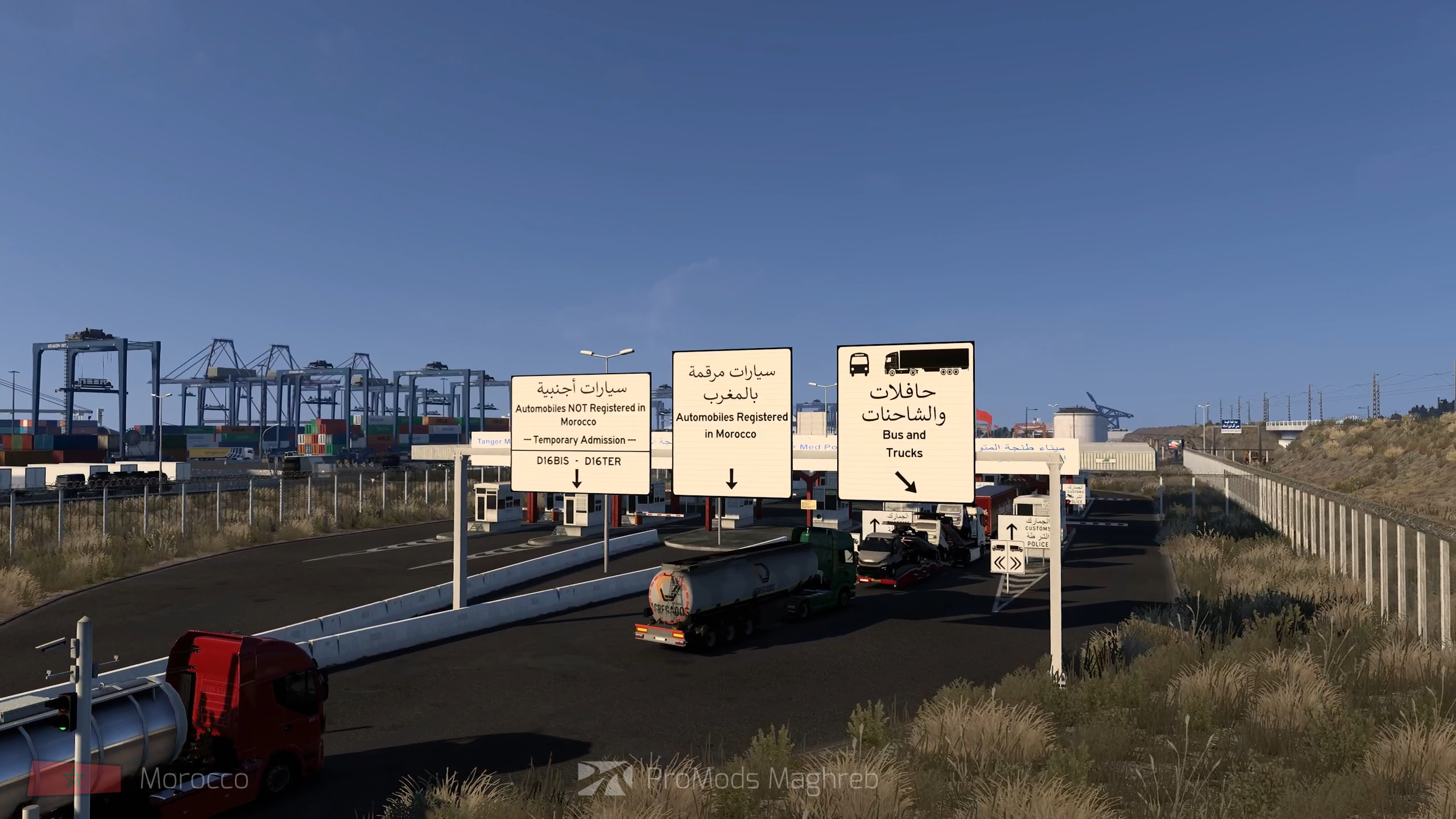ProMods Maghreb bringt zum Start vollständig befahrbare Gebiete in Marokko und Tunesien ins Spiel. Die Anreise erfolgt realistisch per Fähre, wodurch sich die neue Map nahtlos in bestehende Spielstände integrieren lässt. Dabei bleibt die Nutzung flexibel: Maghreb funktioniert sowohl eigenständig als auch in Kombination mit ProMods Europe.
